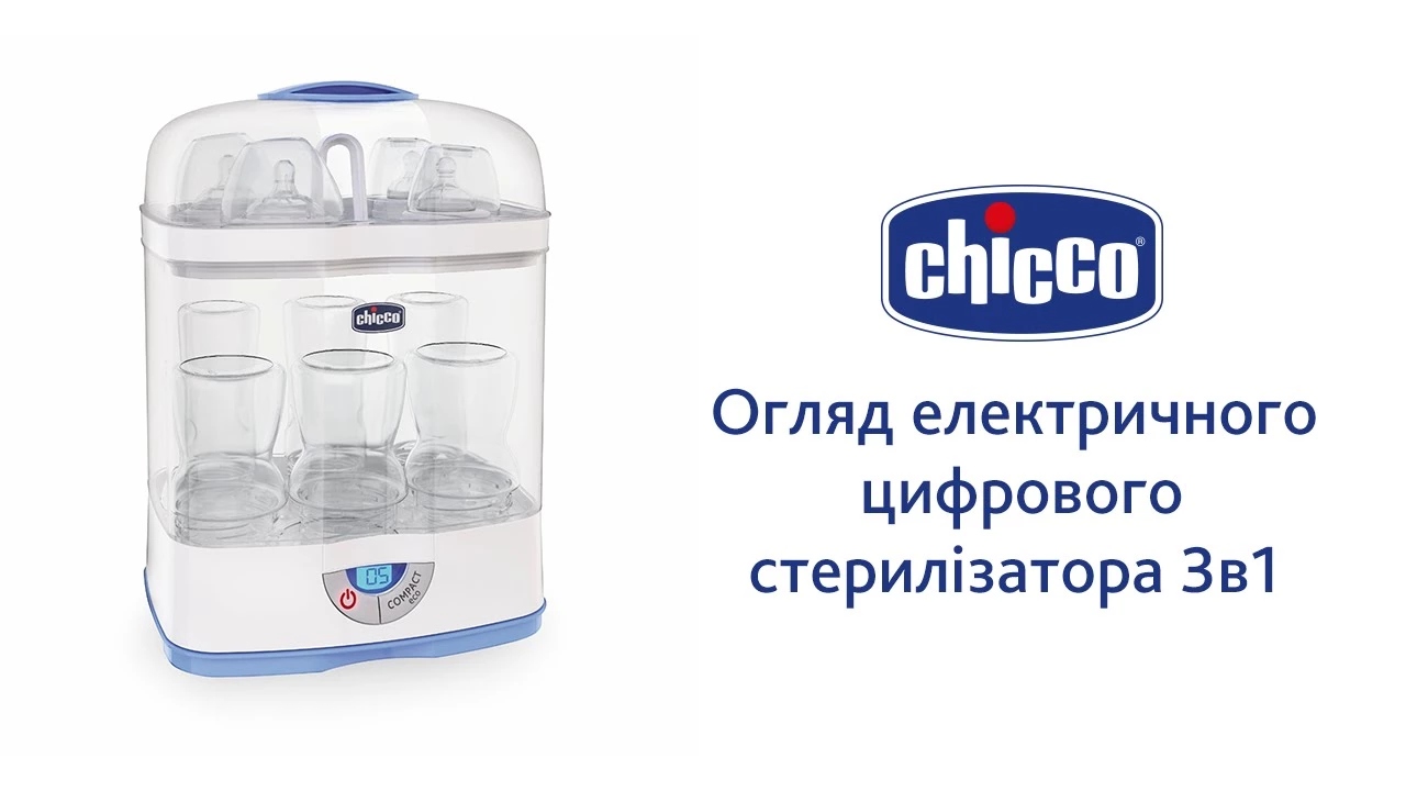 Электрический стерилизатор 3 в 1 от Chicco быстро и результативно дезинфицирует детские предметы (бутылочки, соски, пустышки и др.), уничтожая 99,9% вредоносных бактерий и микробов.